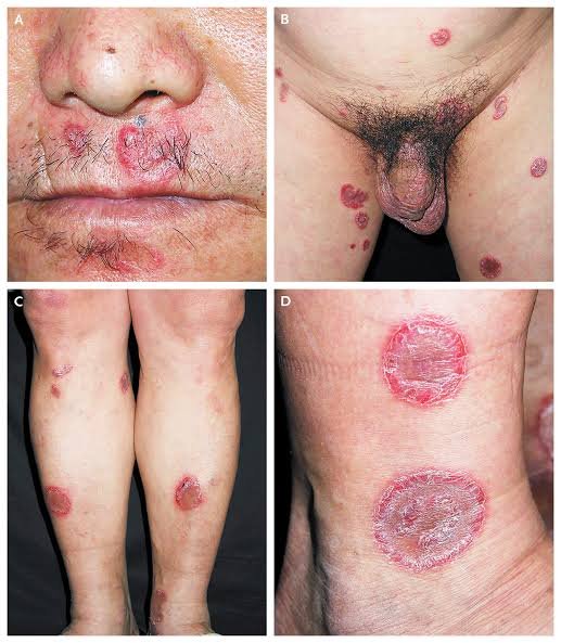 Syphilis causes sore in the penis or vagina and also in the mouth. It can also cause rash on the body.